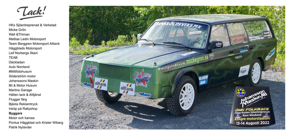 Lotteribil 2022 från Örnsköldsviks Motorklubb Folkrace! Så Här köper du en eller flera lotter: 1. Swisha till 123 42 55 279 2. Märk “Lotteribil 2022” 3. Skriv in summa 100 kr/ lott (ex.100 kr= 1 st lott, 200kr= 2 st lott o.s.v) 4. Vi kommer att dra och fota av lotterna och skicka foto till det mobilnummer som swishat för lotterna, OBS! Det kan dröja upp till 3 arbetsdagar innan du får din/dina lotter. Förvänta er inte svar på dagtid, vänligen vänta -dom kommer! 5. Spara fotona på dina lotter, dragning sker 14 augusti 2022. 6. Lottdragningen kommer att livesändas på ÖMK Folkrace’s facebooksida 7. Vinstlotterna anslås på hemsidan www.ornskoldsviksmk.se samt våra sociala medier Nybyggd Volvo 245 med nya vagnsböcker (en för bilcross och en för folkrace) Ny bur som är godkänd för både bilcross och folkrace Framvagn: Ställbara coilovers Rörbärarmar Genomgångna bromsar Bakvagn: Svetsdiff Ställbara momentstag Sänkt Motor: B230FB Nyrenoverade oljekylda kolvar med nya lager, kolvringar och packning Ny Facet Gold-Flo bränslepump Skelettsvänghjul med nytt kopplingskit från Micke Grön Specialtopplock från Micke Grön Vevaxel 86mm CNC-portad 46.38 ventiler med hårdare fjädrar Ståltryckare AGAP kamaxel 14.6. match portat ÅsaNisse insug med nya fajs 48or, Typ 4 extraktor Övrigt: Customlackad Ny kylare med fläkt Filterking, regulator Stålväxelspak Ny moccaratt Ny stol och bälte Nya plastrutor Nytt batteri Nytt avgassystem Förstärkta skärmkanter bak Aluminiumfälgar med nya Raptor Anneli 195/65/15 och slang Hjulinställning och bromsning kommer att ske innan utlottning!
